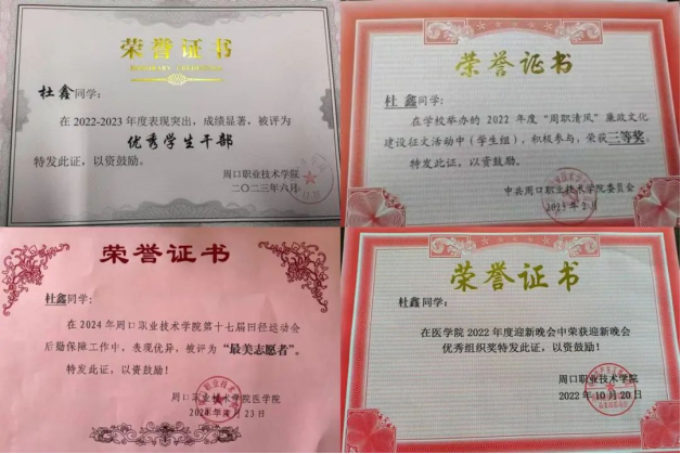 杜鑫,22級康復(fù)治療技術(shù)專業(yè)學(xué)生。現(xiàn)擔(dān)任自律委員會紀(jì)律部長一職。她綜合測評成績在班級排名第二,榮獲“國家勵志獎學(xué)金”、校級“優(yōu)秀學(xué)生干部”、校級“周職清風(fēng)廉政文化三等獎”、院級“優(yōu)秀組織獎”等榮譽(yù)稱號。志愿服務(wù)方面,參加第十七屆田徑運(yùn)動會后勤保障工作,積極為同學(xué)服務(wù),被評為“最美志愿者”稱號。通過這些活動充實了她的大學(xué)生活,讓她在各方面得到了鍛煉提高。