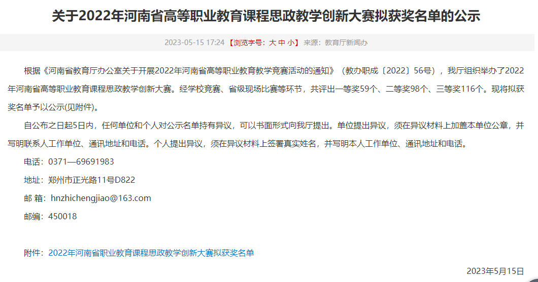 近日,河南省教育廳發(fā)布了《關(guān)于2022年河南省高等職業(yè)教育課程思政教學(xué)創(chuàng)新大賽擬獲獎名單的公示》名單,我院醫(yī)學(xué)影像技術(shù)教師趙燕榮獲財經(jīng)農(nóng)醫(yī)相關(guān)類課程組一等獎,大學(xué)英語教師趙楠榮獲公共基礎(chǔ)課程組三等獎,實現(xiàn)了我院在省級教學(xué)技能競賽中新的突破。