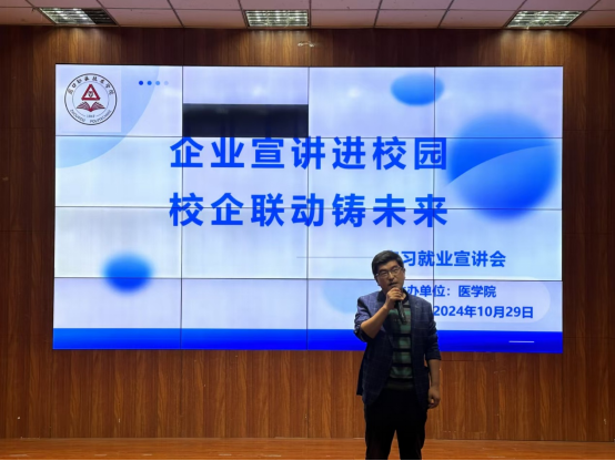 為進(jìn)一步加強(qiáng)校企合作,深化產(chǎn)教融合,10月29日下午,醫(yī)學(xué)院在文昌校區(qū)多媒體室舉辦“企業(yè)宣講進(jìn)校園 校企聯(lián)動(dòng)鑄未來(lái)”宣講會(huì)。邀請(qǐng)周口市規(guī)上制藥企業(yè)工程師為2023級(jí)、2024級(jí)藥學(xué)專業(yè)全體學(xué)生作專題講座。講座由醫(yī)學(xué)院副院長(zhǎng)王向華主持,醫(yī)學(xué)院班子成員、藥學(xué)教研室教師代表參加。